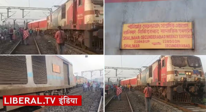 पश्चिम बंगाल में 22850 सिकंदराबाद-शालीमार सुपरफास्ट एक्सप्रेस के कुल 3 डिब्बे पटरी से उतर गए हैं, जिनमें एक पार्सल वैन और 2 डिब्बे शामिल हैं। यह हादसा नालपुर स्टेशन पर मिडिल लाइन से डाउन लाइन में हुआ। किसी को गंभीर चोटें नहीं आई हैं। रेलवे ने 10 बसों से यात्रियों को उनके गंतव्य तक भेजा है। यातायात बहाली का कार्य किया जा रहा है।