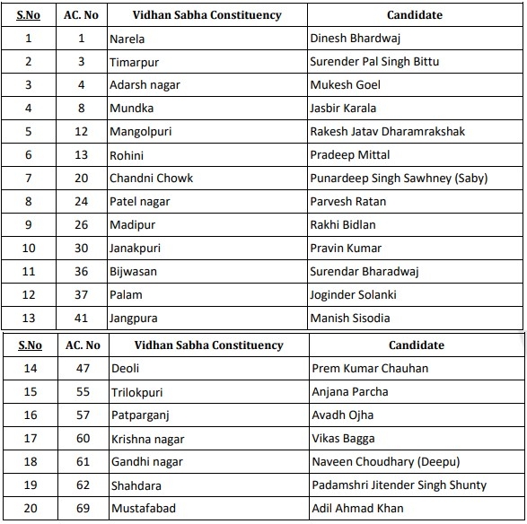 The Aam Aadmi Party (AAP) on Monday released a fresh list of 20 candidates for the upcoming 2025 Delhi Assembly elections, marking significant changes in its strategy for the state polls.
