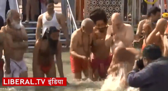 अमित शाह ने त्रिवेणी संगम में लगाई डुबकी.. बाबा रामदेव सहित कई संत थे साथ
