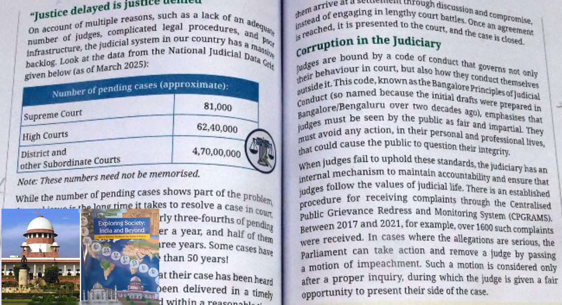 विवाद की जड़ कक्षा 8 की नई किताब ‘एक्सप्लोरिंग सोसाइटी: इंडिया एंड बियॉन्ड’ (Exploring Society: India and Beyond) का अध्याय 4 है, जिसका शीर्षक ‘समाज में न्यायपालिका की भूमिका’ है।