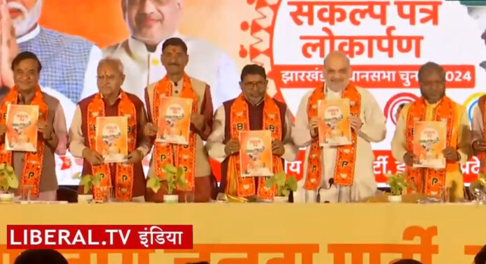 झारखंड के रांची में केंद्रीय गृह मंत्री अमित शाह ने आगामी झारखंड विधानसभा चुनाव के लिए भाजपा का संकल्प पत्र जारी किया। संकल्प पत्र में घुसपैठ और सुरक्षा को बड़ा मुद्दा बनाया गया है। इसके साथ ही महिलाओं को रक्षाबंधन और दीपावली पर एक-एक सिलेंडर मुफ्त देने का वादा किया गया है। महिलाओं को हर महीने 2100 रुपए देने का वादा किया गया है, साथ ही 3 लाख नौकरियां और बेरोजगार युवाओं को 2 हजार रुपए देने का वादा किया गया है।