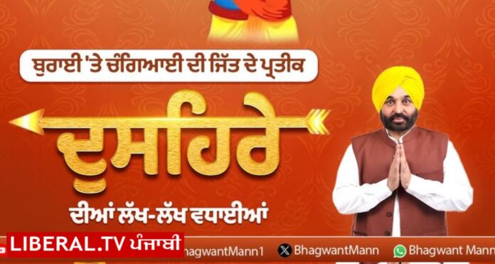 ਬ੍ਰੇਕਿੰਗ : ਮੁੱਖ ਮੰਤਰੀ ਭਗਵੰਤ ਮਾਨ ਨੇ ਦੁਸ਼ਹਿਰੇ ਦੀਆਂ ਦਿੱਤੀਆਂ ਮੁਬਾਰਕਾਂ