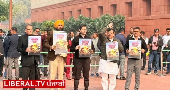 ਜਗਜੀਤ ਸਿੰਘ ਡੱਲੇਵਾਲ ਦੇ ਹੱਕ ਵਿੱਚ ਆਪ ਵਲੋਂ ਸੰਸਦ ਦੇ ਬਾਹਰ ਪ੍ਰਦਰਸ਼ਨ
