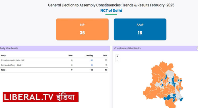 चुनाव आयोग के अनुसार दिल्ली विधानसभा चुनाव में भाजपा 36 सीटों पर आगे चल रही है। इस तरह बीजेपी बहुमत पा चुकी है। आप 16 सीटों पर आगे है। रुझानों के अनुसार भाजपा बहुमत का आंकड़ा पार कर गई है। दिल्ली में 70 विधानसभा सीटें हैं। इस तरह बीजेपी 27 साल बाद वापसी कर रही है।