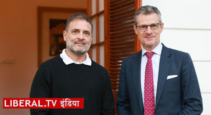भारत में यूरोपीय संघ के प्रतिनिधिमंडल के राजदूत हर्वे डेल्फिन ने लोकसभा नेता प्रतिपक्ष राहुल गांधी से मुलाकात की। इस दौरान दोनों के बीच कई अहम मुद्दों पर चर्चा हुई। हर्वे डेल्फिन न अपने एक्स अकाउंट पर खुद मुलाकात की तस्वीरें शेयर की हैं। इस दौरान राहुल गांधी प्रसन्न और शांत मुद्रा में दिखाई दे रहे हैं।