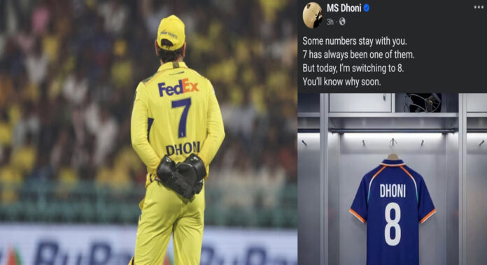 धोनी ने अपने आधिकारिक फेसबुक और इंस्टाग्राम अकाउंट पर एक रहस्यमयी वीडियो साझा किया, जिसमें ‘नंबर 7’ की जर्सी को हटाकर उसकी जगह ‘नंबर 8’ की जर्सी टांगते हुए दिखाया गया है। उन्होंने कैप्शन में लिखा, “कुछ नंबर आपके साथ रहते हैं। 7 हमेशा से उनमें से एक रहा है। लेकिन आज, मैं 8 पर स्विच कर रहा हूं। आपको जल्द ही पता चलेगा कि क्यों।”