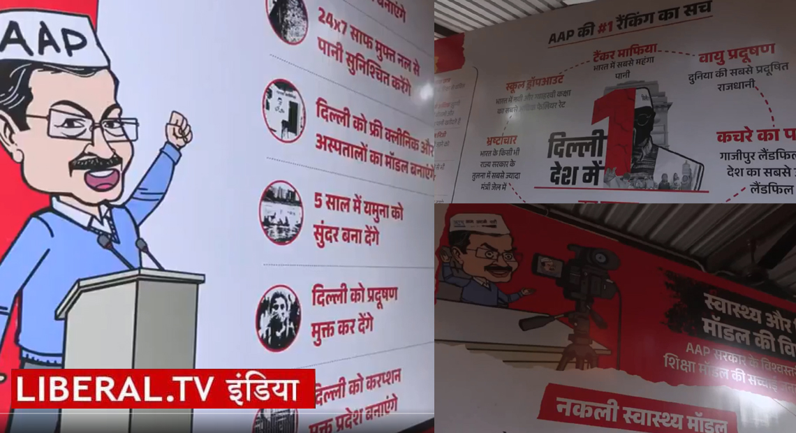 दिल्ली भाजपा कार्यालय के बाहर आम आदमी पार्टी सरकार को निशाना बनाते हुए पोस्टर लगाए गए। पोस्टर में आप के राष्ट्रीय संयोजक अरविंद केजरीवाल का कार्टून दिखाकर उनकी घोषणाएं दर्शाई गई हैं, तो दूसरे पोस्टर में अब तक क्या हुआ इसे दर्शाया गया है, जिसमें कचरे का पहाड़, यमुना का प्रदूषण, वायु प्रदूषण, भ्रष्टाचार, टैंकर माफिया का उल्लेख है।