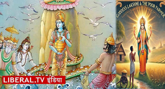 यह दृश्य देखकर भगवान विष्णु क्रोधित हो गए। उन्होंने माता लक्ष्मी को आज्ञा का उल्लंघन करने के लिए दंड दिया और कहा, “अब तुम्हें बारह वर्षों तक इस किसान के घर निवास करना होगा।“