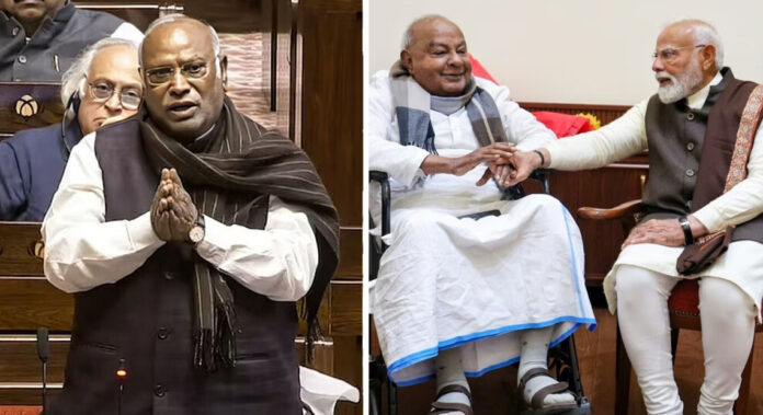राज्यसभा में विदाई का अवसर अक्सर भावुक होता है, लेकिन जब राजनीति के दिग्गज आमने-सामने हों, तो इसमें चुटकी और तंज का तड़का भी लग जाता है। पूर्व प्रधानमंत्री एचडी देवेगौड़ा की राज्यसभा से विदाई के मौके पर कांग्रेस अध्यक्ष मल्लिकार्जुन खरगे ने एक ऐसा बयान दिया, जिसने पूरे सदन को ठहाकों से भर दिया। खरगे ने देवेगौड़ा के राजनीतिक सफर और उनके वर्तमान झुकाव पर तंज कसते हुए कहा— “मोहब्बत हमारे साथ, लेकिन शादी मोदी साहब के साथ।”