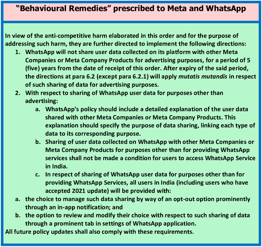 The CCI (Commission) imposed a penalty of Rs. 213.14 crore on Meta for “abusing its dominant position” This relates to how WhatsApp’s 2021 Privacy Policy was implemented and how user data was collected and shared with other Meta companies. The Commission also issued cease-and-desist directions and also directed Meta and WhatsApp to implement certain behavioural remedies within a defined timeline.