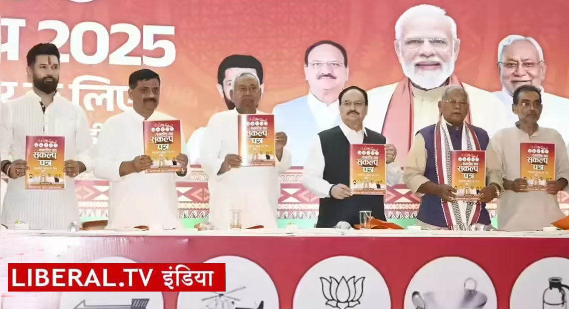 राष्ट्रीय जनतांत्रिक गठबंधन (NDA) ने बिहार चुनाव के लिए अपना ‘संकल्प पत्र 2025’ जारी कर दिया है। पटना के एक होटल में जारी किए गए इस घोषणा पत्र को विकसित बिहार का ब्लू प्रिंट बताया गया है। घोषणा पत्र सीएम नीतीश कुमार, भाजपा के राष्ट्रीय अध्यक्ष जेपी नड्डा, चिराग पासवान, उपेंद्र कुशवाहा समेत सभी प्रमुख घटक दलों के नेताओं की उपस्थिति में जारी हुआ। बाद में, उप मुख्यमंत्री सम्राट चौधरी ने एनडीए की ओर से प्रमुख घोषणाओं के बारे में जानकारी दी।