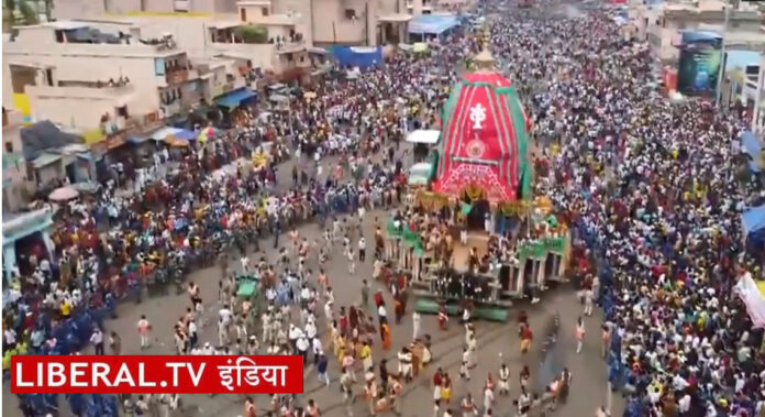 ओडिशा के पुरी में आयोजित दो दिवसीय भगवान जगन्नाथ रथ यात्रा के दूसरे दिन बड़ी संख्या में श्रद्धालु एकत्रित हुए। इस दौरान श्रद्धालुओं ने महाप्रभु जगन्नाथ के जयकारे लगाए और जगत की खुशहाली की प्रार्थना की। श्रद्धालुओं ने भगवान जगन्नाथ का रथ खींचा। रथयात्रा से पहले प्रभु जगन्नाथ, भैया बलदाऊ और बहन सुभद्रा की पूजा-अर्चना की गई।