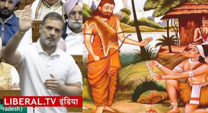 लोकसभा के नेता प्रतिपक्ष राहुल गांधी ने लोकसभा में संविधान पर चर्चा करते हुए महाभारत की कहानी सुनाई। उन्होंने कहा कि एक बच्चा था, जो सुबह उठकर अभ्यास करता था। एक दिन वह अपने गुरु द्रौणाचार्य के पास गया तो उन्होंने एकलव्य से पूछा कि तुमने यह कहां से सीखा। तो बालक एकलव्य ने कहा कि आपसे से ही सीखा है। तब द्रौणाचार्य ने कहा कि मैं नीची जाति के बालकों को नहीं सिखाता। राहुल के इस भाषण के दौरान सत्ता पक्ष ने हंगामा किया। स्पीकर ओम बिरला ने भी उनकी इस कहानी पर आपत्ति जताई। सत्ता पक्ष के सांसदों ने आपत्ति जताई और कहा कि द्रौणाचार्य ने अंगूठा नहीं काटा था।