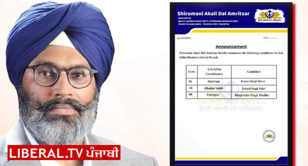 ਸ਼੍ਰੋਮਣੀ ਅਕਾਲੀ ਦਲ ਨੇ ਆਗਾਮੀ ਲੋਕ ਸਭਾ ਚੋਣਾਂ ਦੇ ਲਈ ਅੰਮ੍ਰਿਤਸਰ ਤੋਂ ਆਪਣਾ ਉਮੀਦਵਾਰ ਐਲਾਨ ਦਿੱਤਾ ਹੈ। ਐਮਪੀ ਸਿਮਰਨਜੀਤ ਸਿੰਘ ਮਾਨ ਦਾ ਉੱਤਰ ਇਮਾਨ ਸਿੰਘ ਨੂੰ ਅਕਾਲੀ ਦਲ ਵੱਲੋਂ ਟਿਕਟ ਦਿੱਤੀ ਗਈ ਹੈ। ਇਸ ਦੇ ਨਾਲ ਹੀ ਦੋ ਹੋਰ ਲੋਕ ਸਭਾ ਚੋਣ ਹਲਕਿਆਂ ਤੋਂ ਵੀ ਉਮੀਦਵਾਰਾਂ ਦੇ ਨਾਮ ਦਾ ਐਲਾਨ ਸ਼੍ਰੋਮਣੀ ਅਕਾਲੀ ਦਲ ਵੱਲੋਂ ਕੀਤਾ ਗਿਆ ਹੈ।