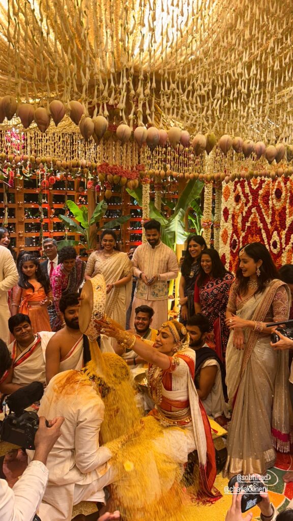 An unseen picture from the Talambralu ceremony, a cherished Telugu wedding ritual, has gone viral on social media. The image captures Sobhita, dressed in a stunning red and white Kanjivaram saree, joyously pouring a rice and turmeric mixture over Naga Chaitanya, who looked elegant in an ivory sherwani. The ceremony, surrounded by family and friends, symbolizes the couple showering each other with love, happiness, and prosperity.