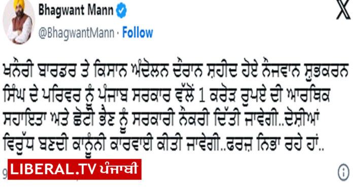 ਚੰਡੀਗੜ੍ਹ/ਬਿਊਰੋ ਨਿਊਜ਼ : ਕਿਸਾਨ ਅੰਦੋਲਨ ਦੌਰਾਨ ਖਨੌਰੀ ਬਾਰਡਰ ’ਤੇ ਸ਼ਹੀਦ ਹੋਏ ਨੌਜਵਾਨ ਕਿਸਾਨ ਸ਼ੁਭਕਰਨ ਸਿੰਘ ਦੇ ਪਰਿਵਾਰ ਨੂੰ ਪੰਜਾਬ ਸਰਕਾਰ ਵਲੋਂ 1 ਕਰੋੜ ਰੁਪਏ ਦੀ ਸਹਾਇਤਾ ਰਾਸ਼ੀ ਦਿੱਤੀ ਜਾਵੇਗੀ। ਇਹ ਐਲਾਨ ਪੰਜਾਬ ਦੇ ਮੁੱਖ ਮੰਤਰੀ ਭਗਵੰਤ ਮਾਨ ਵਲੋਂ ਕੀਤਾ ਗਿਆ ਹੈ। ਮੁੱਖ ਮੰਤਰੀ ਨੇ ਇਹ ਵੀ ਕਿਹਾ ਕਿ ਸ਼ੁਭਕਰਨ ਸਿੰਘ ਦੀ ਛੋਟੀ ਭੈਣ ਨੂੰ ਸਰਕਾਰੀ ਨੌਕਰੀ ਵੀ ਦਿੱਤੀ ਜਾਵੇਗੀ।