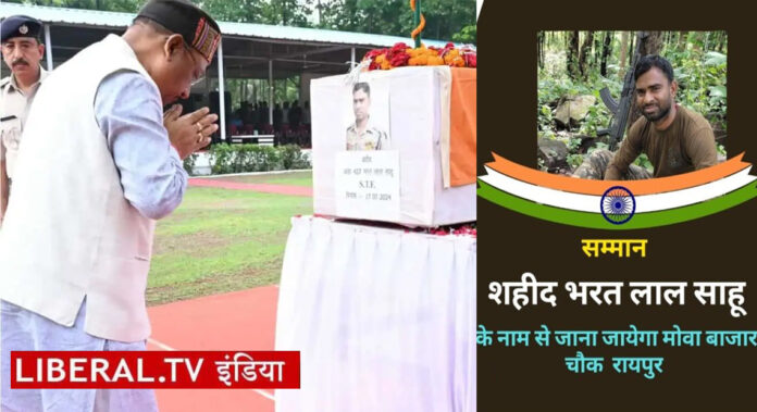 छत्तीसगढ़ के मुख्यमंत्री विष्णु देव साय और मंत्रिपरिषद के सदस्यों ने शहीद भरत लाल साहू की स्मृति को अक्षुण्ण रखने के लिए अहम फैसला लिया है। कैबिनेट ने मोवा बाजार चौक रायपुर का नामकरण उनके नाम से शहीद भरत लाल साहू चौक करने का निर्णय लिया है। मुख्यमंत्री विष्णु देव साय एवं मंत्रिपरिषद के सहयोगियों ने शहीद भरत लाल साहू को श्रद्धांजलि अर्पित करने के साथ ही उनकी स्मृति में मोवा बाजार चौक रायपुर का नामकरण शहीद भरत लाल साहू चौक किए जाने का निर्णय लिया है।