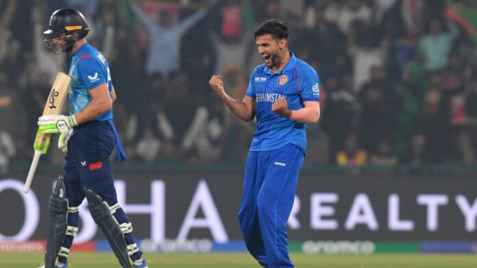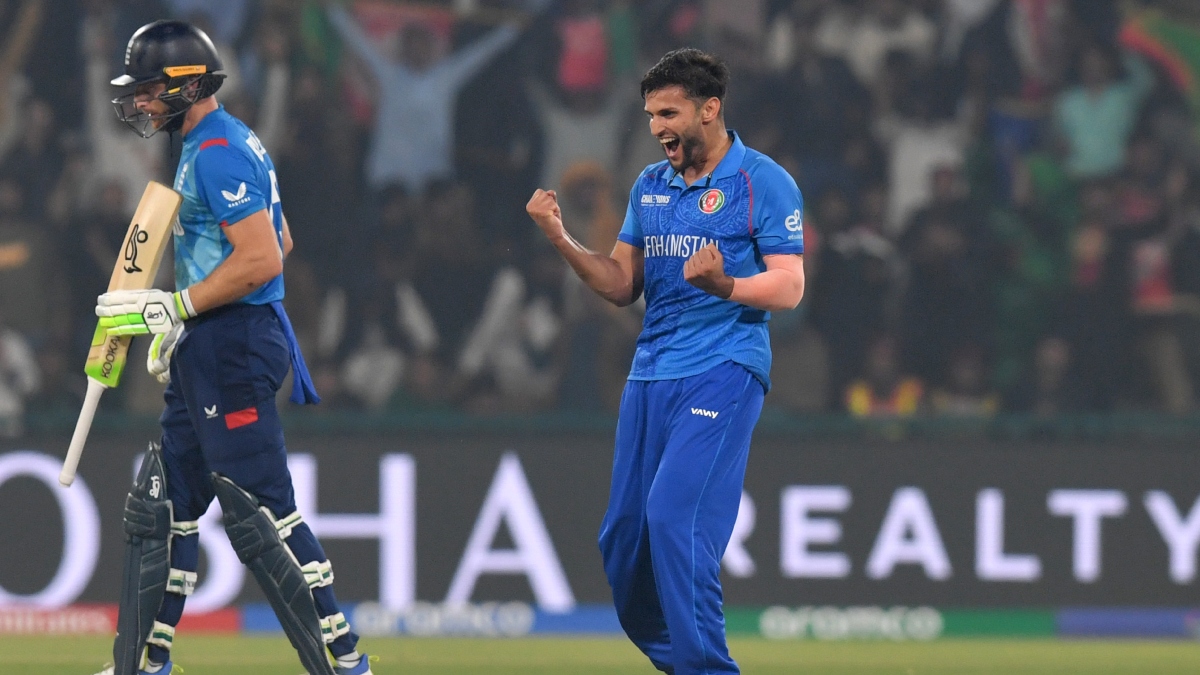 अजमातुल्लाह उमरजई ने 9.5 ओवर में 58 रन देकर 5 विकेट हासिल किए, उन्होंने फिलिप सॉल्ट. जो रूट, जोस बटलर, जैमी ओवरटन और आदलि रशीद को अपना शिकार बनाया। इससे पहले बल्लेबाजी में 31 गेंदों में 40 रन की ताबड़तोड़ पारी खेली।