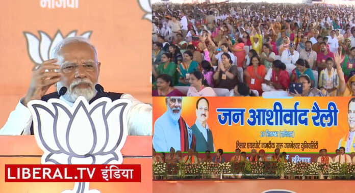 प्रधानमंत्री नरेंद्र मोदी हरियाणा के हिसार पहुंचे। यहां सार्वजनिक रैली को संबोधित करते हुए उन्होंने कहा कि कांग्रेस के नेता अब कहने लगे हैं कि हरियाणा में भी वही हाल होगा जो कांग्रेस का मध्य प्रदेश में हुआ था। मध्य प्रदेश और राजस्थान में पिछले चुनाव में इन्होंने झूठ का गुब्बा खूब फुलाया लेकिन जनता ने वोट की चोट देकर उस गुब्बारे की हवा निकाल दी। कांग्रेस का यह हाल इसलिए होता है क्योंकि कांग्रेस देश की सबसे धोखेबाज़ और बईमान पार्टी है। कांग्रेस ने अपने वादों से पल्ला झाड़ लिया है। जनता कांग्रेस से कह रही है क्या हुआ तेरा वादा।